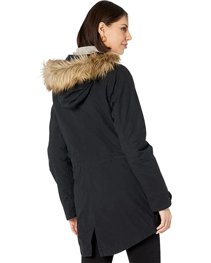 - Removable faux fur ruff trims the attached hood.